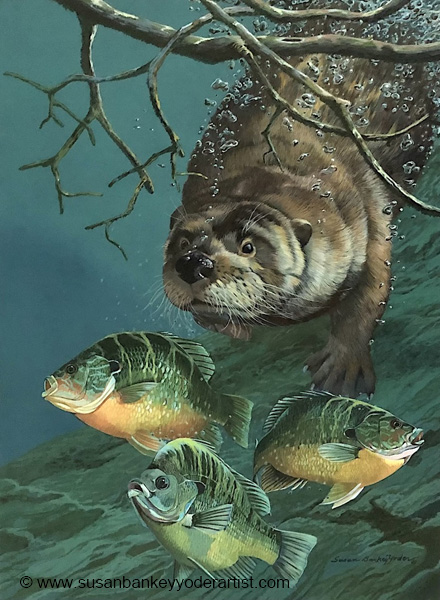 This painting is an underwater scene with a river otter and three